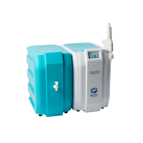 L’Aquinity² P produit de l’eau déionisée ( 1 MOhm x cm) grâce à l’osmose inverse et un module de conditionnement vers un réservoir externe (35 ou 70 litres). L’eau peut être utilisée directement pour le nettoyage de verrerie ou connectée à un lave-vaisselle de laboratoire. L’eau ultrapure est ensuite produite à partir du réservoir et distribuée via un distributeur flexible.